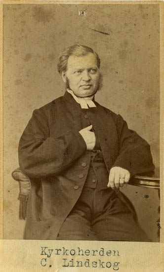 Text på kortets baksida: "Claes Sven Lindskog, f. 1820. T. o. Fil. dr. kyrkoherde 1861 i