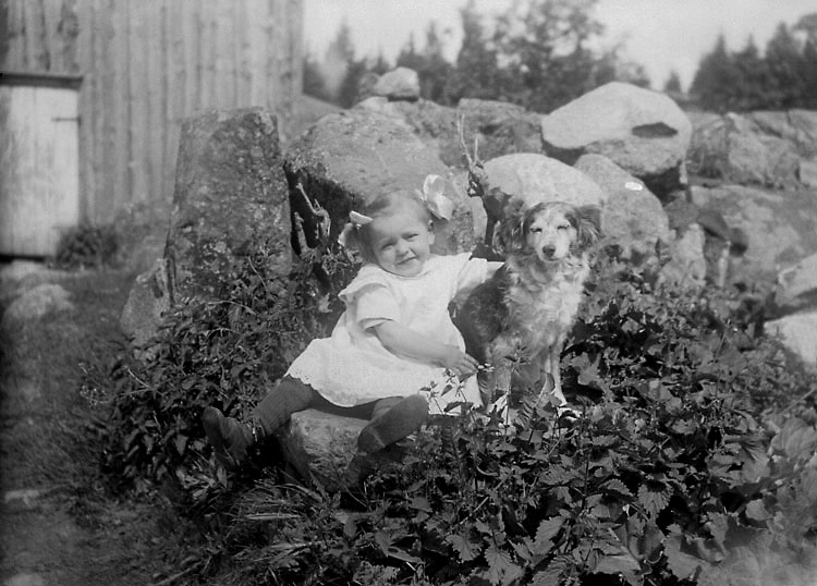 Enligt senare noteringar: "Två småttingar från Röd i Forshälla, (hunden och minsta flickan), 9/7 1916. "