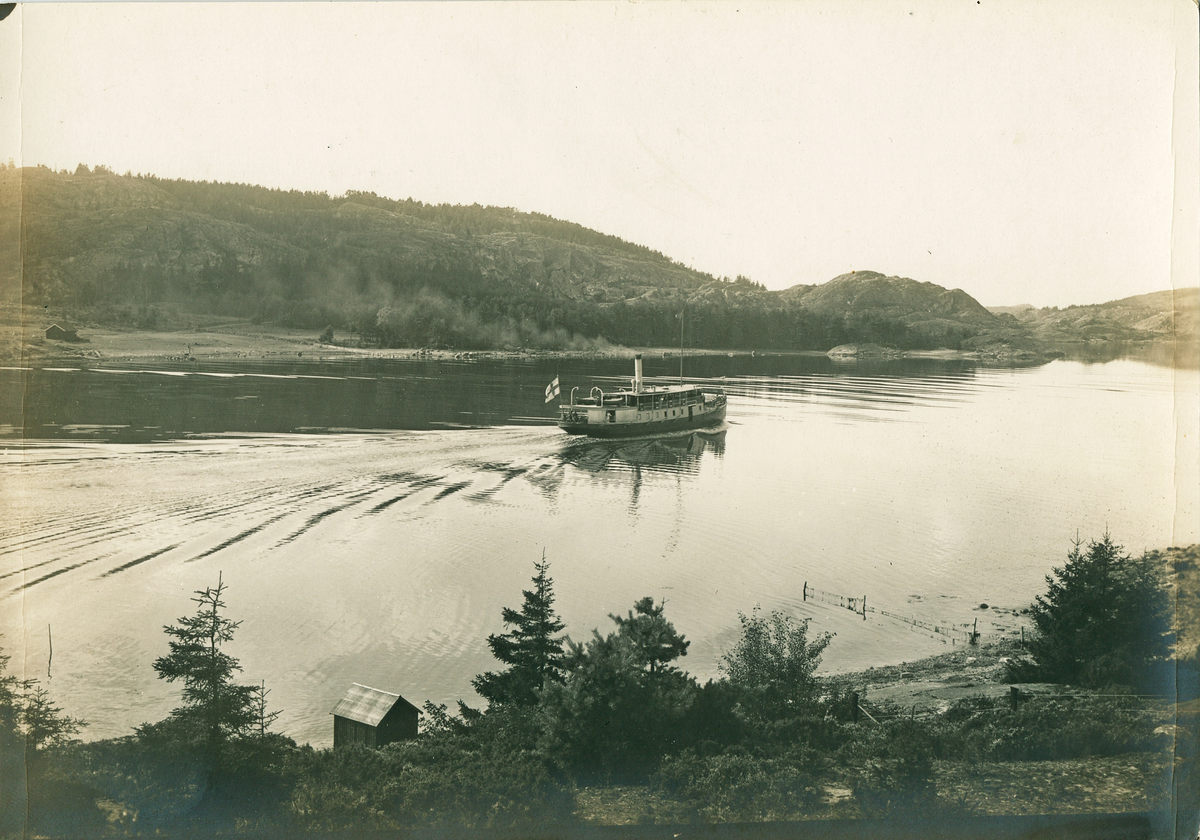 Ångbåt på vattnet med ett bergigt landskap i bakgrunden.
