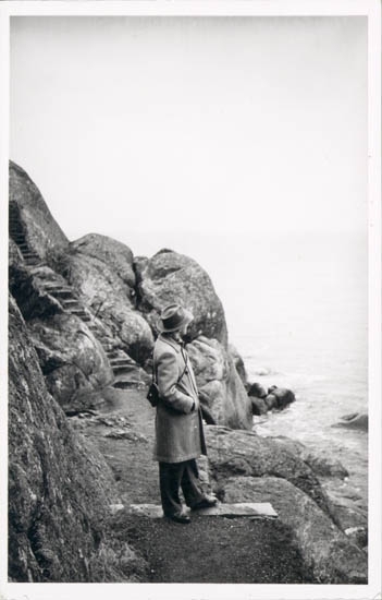 Noterat på kortet: Marstrand. Karl Jacobson vid strandpromenaden, norra inloppet. 10/57."