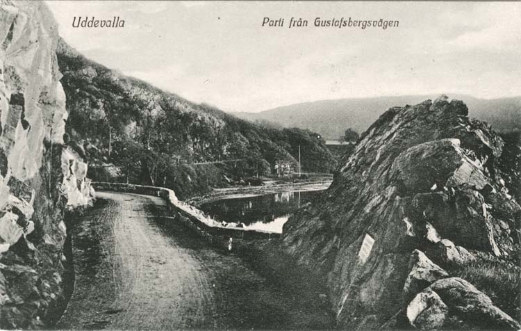 Tryckt text på vykortets framsida: "Uddevalla Parti från Gustafsbergsvägen."
