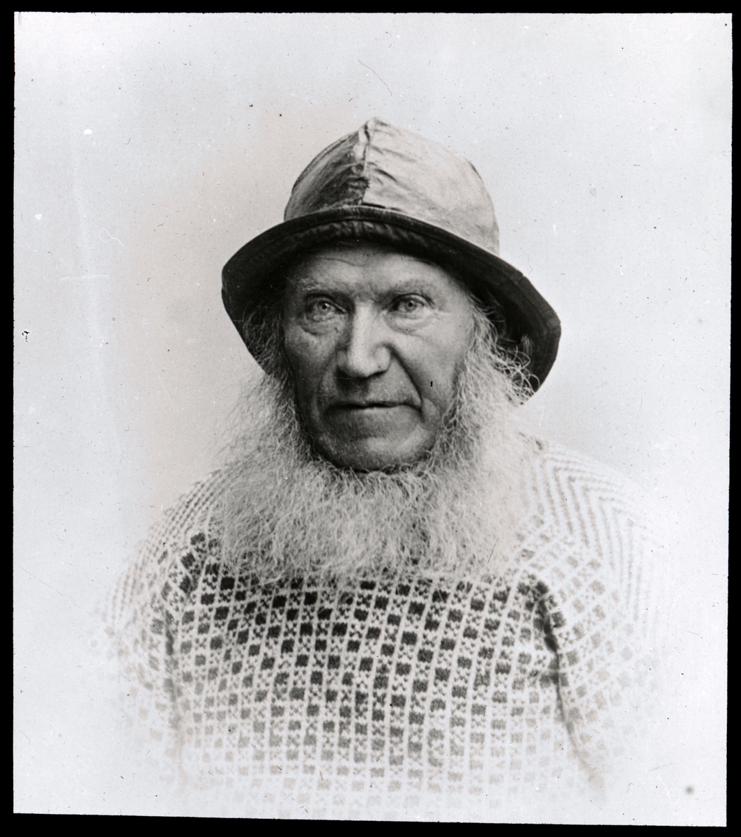 "Fiskargubbe. Fiskargubbe från Bohuslän klädd i ulltröja och sydväst."