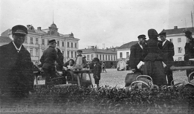 Bilden var uppklistrad på ett A4 papper. På papperet under bilden stod följande handskrivna text: "Uddevalla. Torghandel omkr. 1900 - 05".