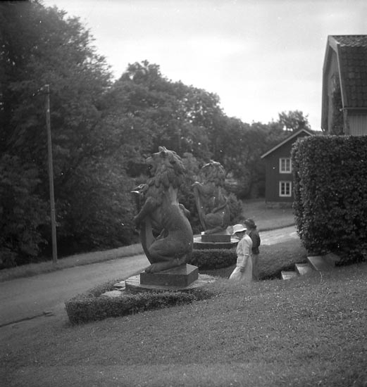 Två lejon med sköldar, skulpturer av nedanför huvudentrén på Morlanda Säteri, Orust. 1900-talets början.