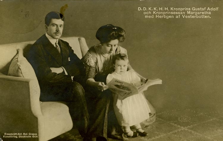 Vykort. "D. D. K. K. H. H. Kronprins Gustaf Adolf och Kronprinssesan Margaretha med Hertingen af Vesterbotten"