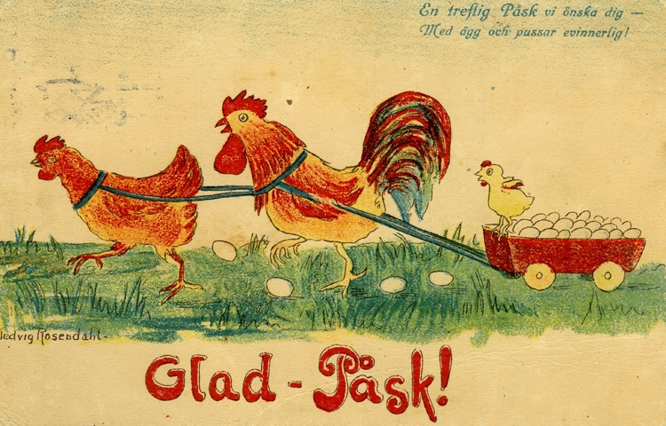 Kort: "En treflig Påsk vi önskar dig - Med ägg och pussar evinnerlig! Glad Påsk!" Tupp och höna som drar en vagn med ägg.