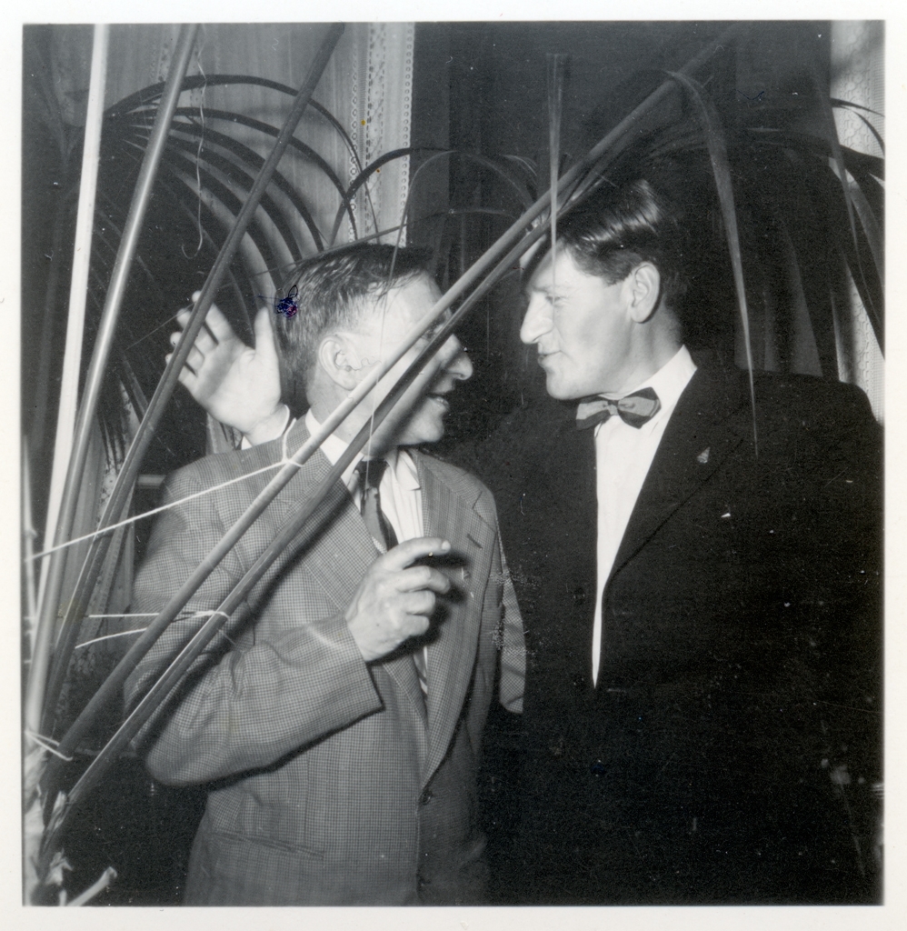 Två män står och pratar vid en fest anordnad av Monarks cykelverkstad för personalen. Ena mannen skyms av en större krukväxt.