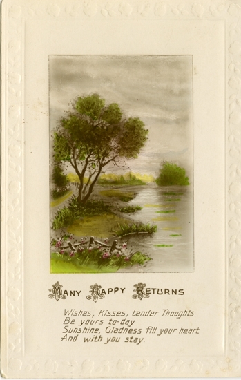 Notering på kortet: Many Happy Returns. Wishes, Kisses, tender Thoughts Be your to-day. Sunshine, Gladness fill your heart And with you stay.