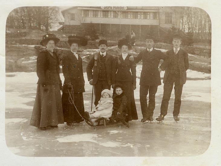 "Skridskoåkare framför Stora Hotellet. Lyckorna" enligt Bengt Lundins notering.