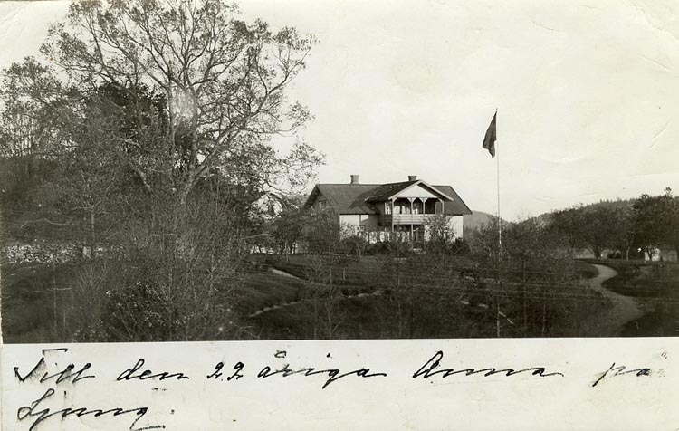 Kommentar: "Lilla Ljungs skymtar mellan kyrkogårdsmur och St Ljung till höger skymtar hönhuset".