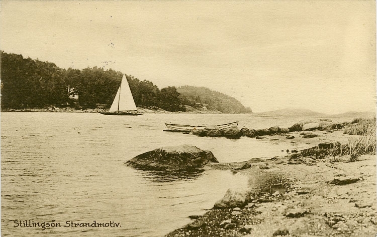 Enligt Bengt Lundins noteringar: "Stillingsön. Strandmotiv med segelbåt"
