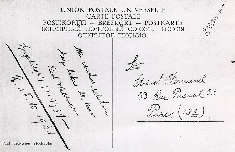 Baksida av vykort sänt till adressat Strivet Fernand, 53 Rue Pascal, Paris från Karl Waldner, Ljungskile