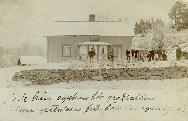 Enligt Bengt Lundins noteringar: "Ljungskile. Lilla Tollesröd i vinterskrud med folk"