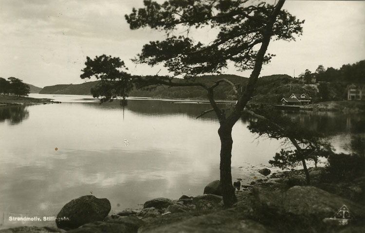 Enligt Bengt Lundins noteringar: "Stillingsön. Strandmotiv med ensam tall".