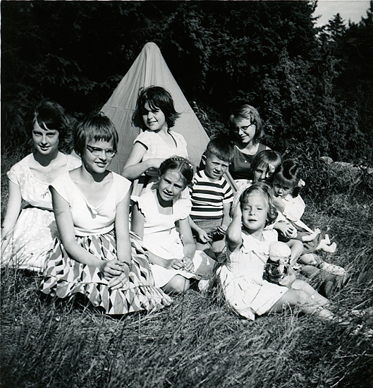 7/7 1959, mitt födelsedagskalas. Gäster vid mitt oranga partytält: Karin Molin, Britta Molin, båda Enköping, somrar i Smögen-Gravarne; Elisabeth Madgård; Inger Wetterlund; Martin Hansson f. 1953 Uddevalla (järnhandeln), sommar- granne; Ann Madgård; Misse Stoltz Norrköping, sommarhus med Hanson, f. 1948, lekte med Inger; Ulrika Hansson, yngre syster till Martin, med vackert kopparrött långt hår. Veronika med docka Kerstin i reskläder.