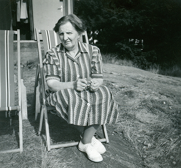 Mormor sommaren 1955. Judit Abrahamsson (f. Backman) (1888 - 1957) i solstol utanför södersidan.