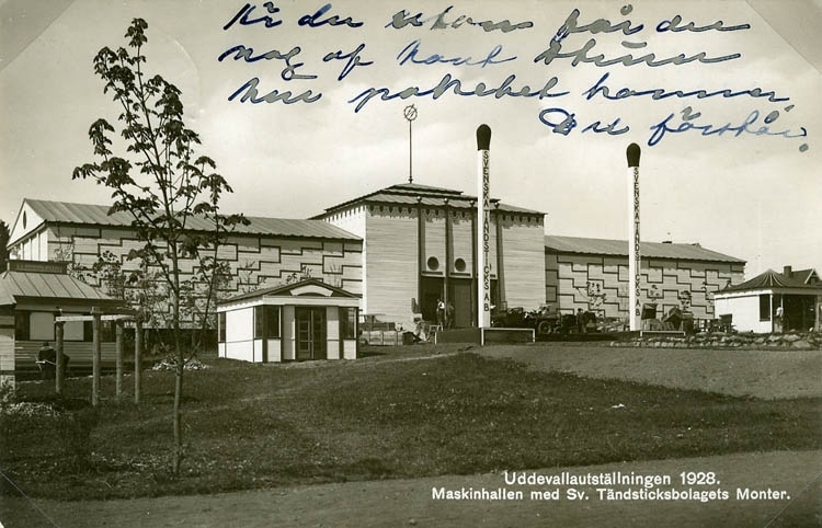 "Uddevallautställningen 1928. Sv. Tändsticksbolagets monter". lyder text på vykortet