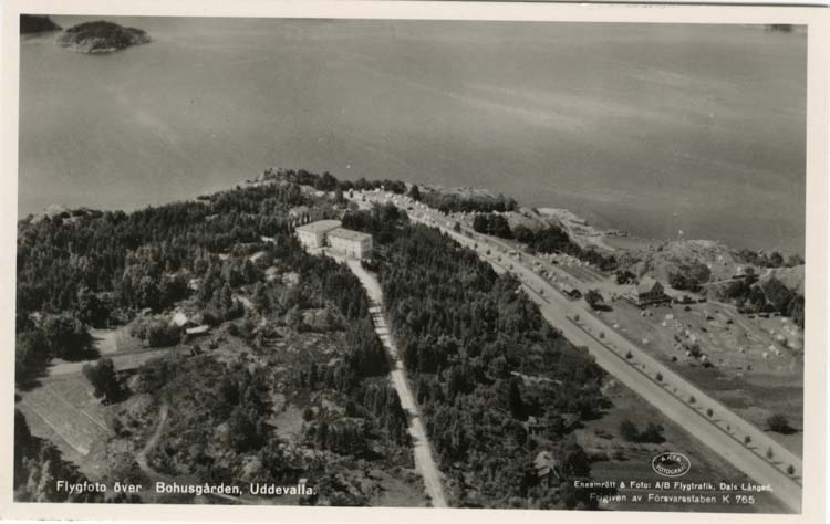 Tryckt text på vykortets framsida: "Flygfoto över Bohusgården, Uddevalla."