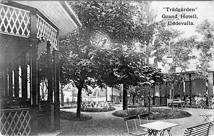 Tryckt text på vykortets framsida: "Trädgården" Grand Hotell, Uddevalla."