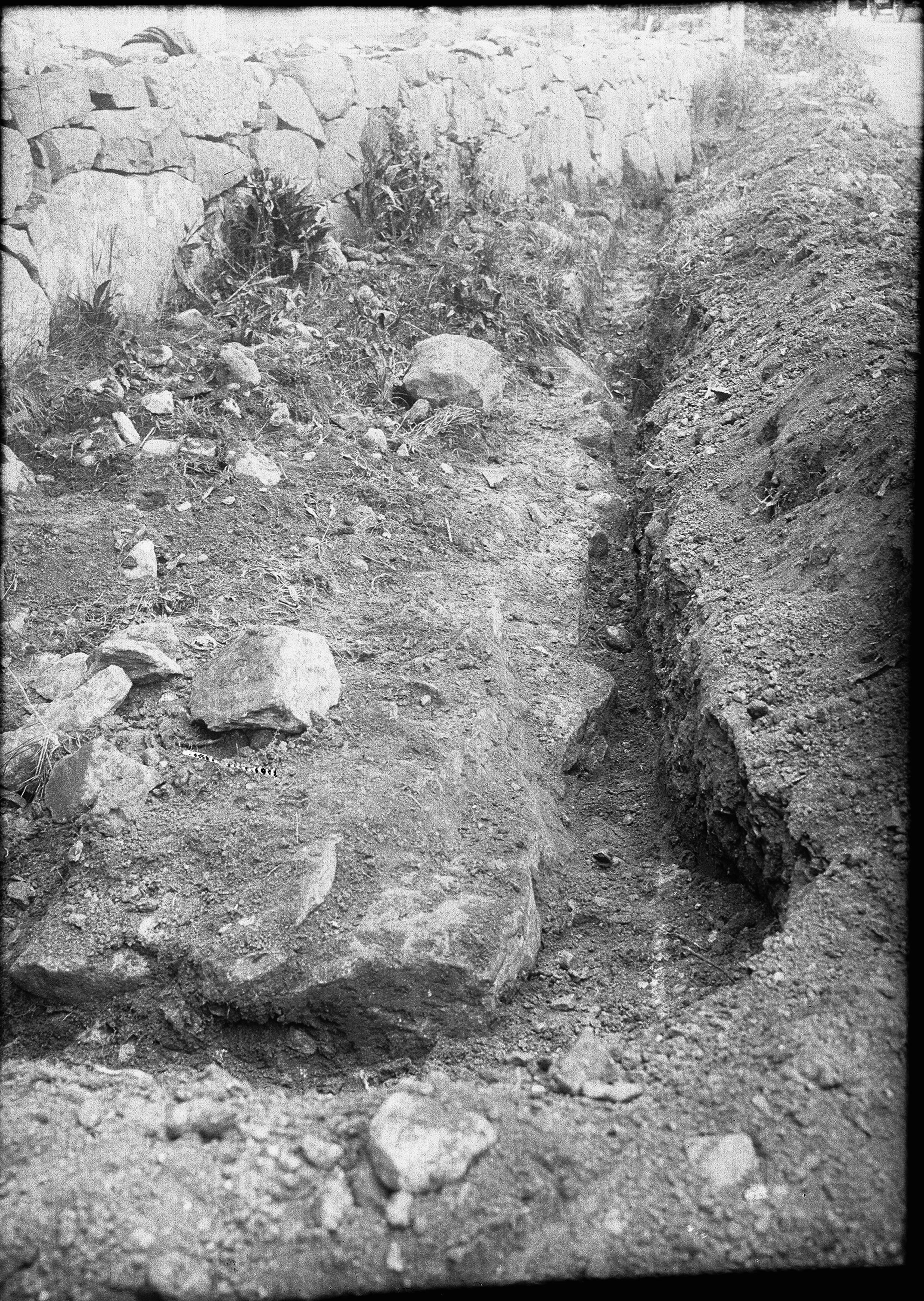 Västra kyrkogårdsmuren från söder med sydvästra hörnet och västra delen av muren.