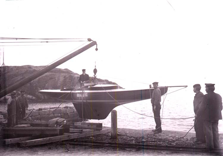 Segelbåten "Greta" sjösätts i Kyrkvik, Lysekil våren 1907