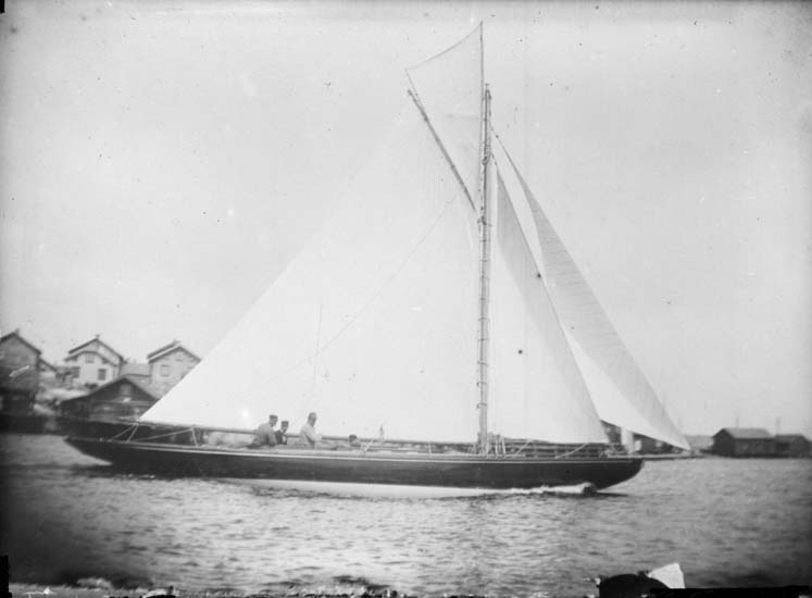 Enligt text som medföljde bilden: "Vid Tången. En norsk modern lustjakt för fulla segel, "Brand" från Fredrikshald 9/7 1899."