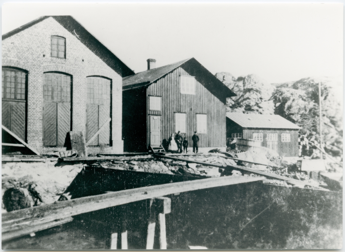 Tre fabriksfasader samt delar av det omkringliggande området. Framför det mittersta huset står en kvinna, två män och en pojke.