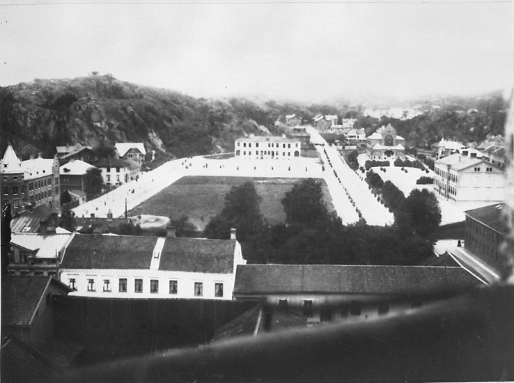 Tidigare notering: "Margretegärde, Skolgatan från Klocktornsberget."