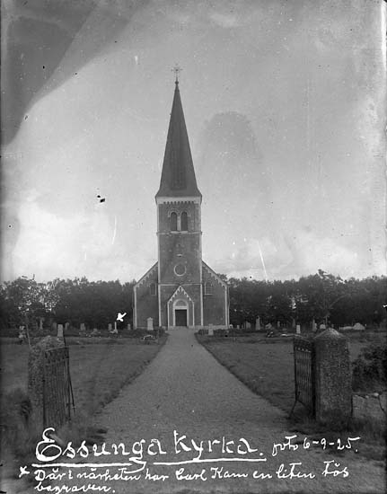 Enligt text på fotot: "Essunga kyrka. foto 6-9-25. x Där i närheten har Carl Kam en liten tös begraven".
