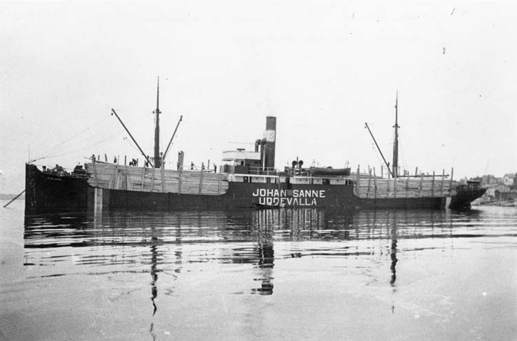 Handskriven text på kopians baksida: "S/S "Johan Sanne" lastar virke i norrlandshamn under 1:a världskriget".