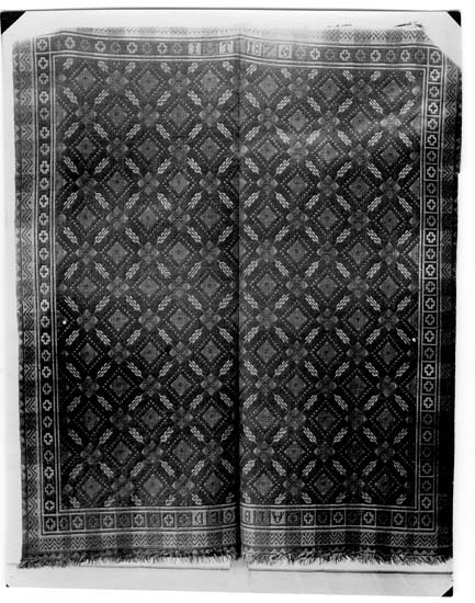 "Finnvävnad utställd vid spånadstävling i Stenungsund 1930. Tillhör fru Hanna Karlsson" Täcket har invävt "IMT 1876" enligt uppgift på kortets baksida.