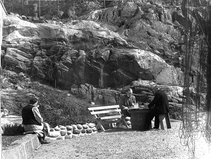 Enligt uppgift: "Eftermiddagskaffe år ca 1949. T.v. dåvarande husmodern Jenny Fagerberg, forskare Nils Jerlov och trålmästaren på forskningsfartyget "Skagerack", August Nilsson".