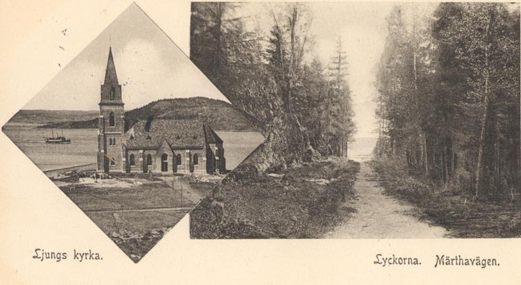 Tryckt text på kortet: "Ljungs Kyrka. Lyckorna. Märthavägen".