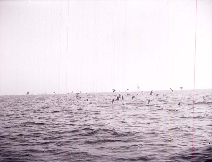 Enligt text som medföljde bilden: "Fiskmåsar i närheten af ångbåtarne".