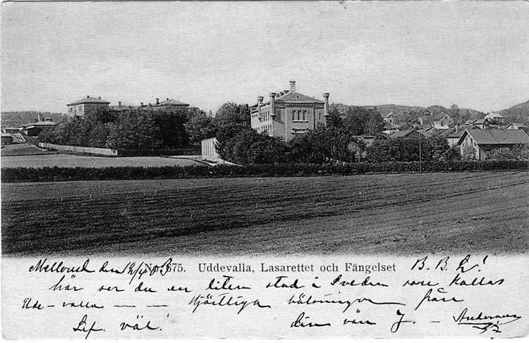 Tryckt text på vykortets framsida: "Uddevalla. Lasarettet och Fängelset".
