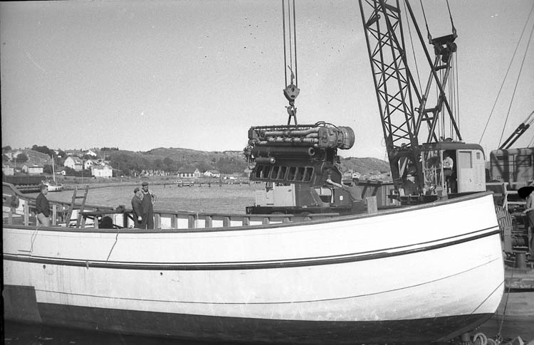 Enligt fotografens notering: "Skanidamotor lyfts i fiskebåt 1962".