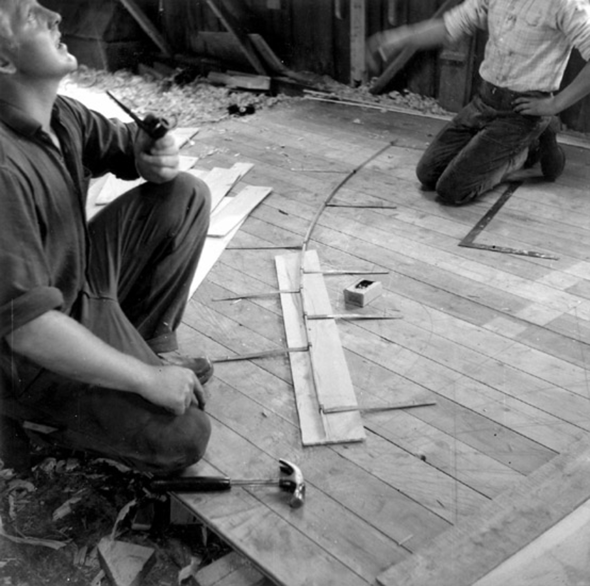 Skrivet på vidhängande papper: Spantformen överförs från traekstok till mallbräda.