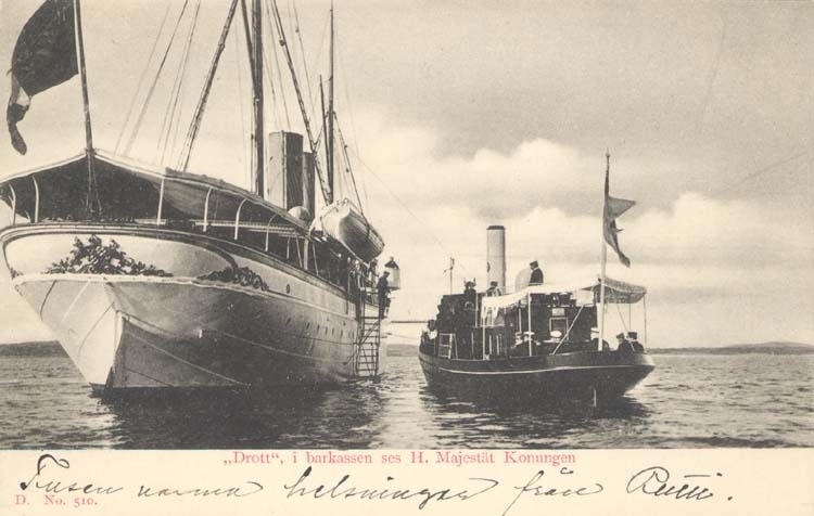 Tryckt text på kortet: "Drott, i barkassen ses H. Majestät Konungen."