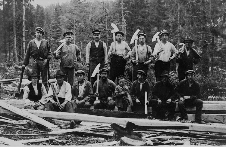 Nedersta raden fr v Gunnar Gunnarsson, Övre Röra. Artur Henningsson Röd. Erik Björner, Känstorp. Lars Karlsson, Enerås och hans son Ivar. Sist i raden 3 rundvirkeshuggare från Västergötland".