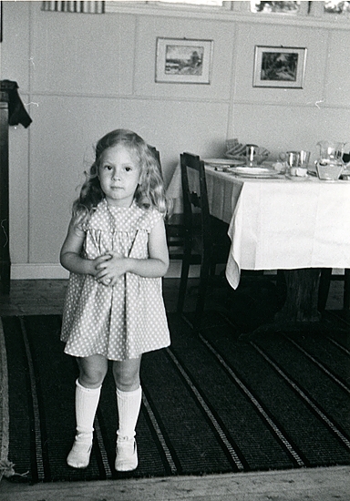 Sommaren 1957 i storstugan i ljusblå klänning, omsydd av Birgits.