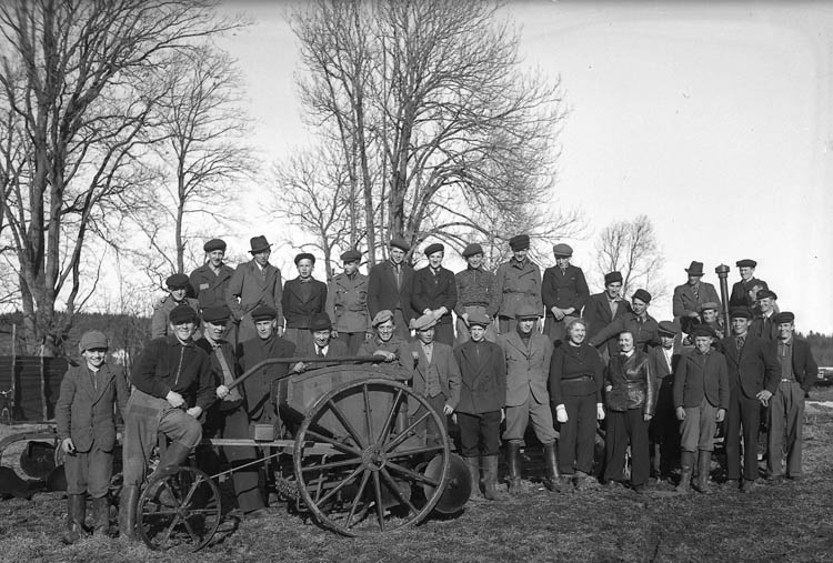 Text till bilden:"Samling kring en potatissättare på hjul. April 1940".