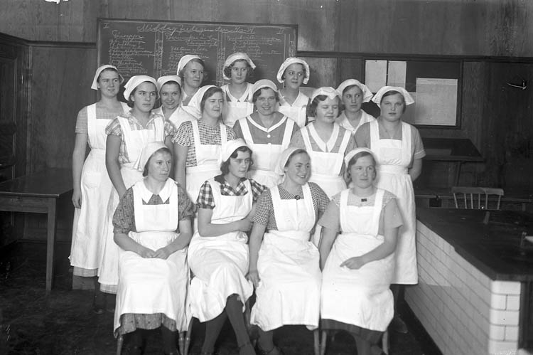 Text till bilden:"Skolkökselever. Recept på olika middagsrätter på svarta tavlan.".