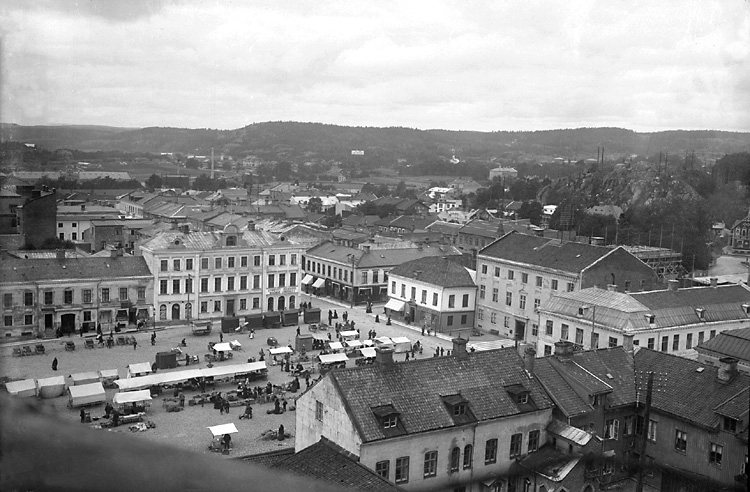 Enligt tidigare notering: "Torget i Uddevalla, en torgdag, från Klocktornet."