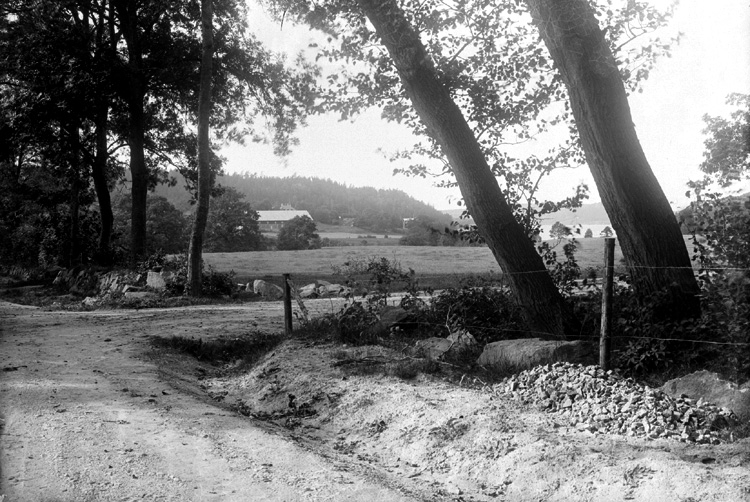 Enligt tidigare notering: "Vägparti nedanför, väster Kristinedal. I bakgrunden ladugårdsbyggnader vid Gustafsberg (vägkrysset Höjentorp-Göteborgsvägen)".