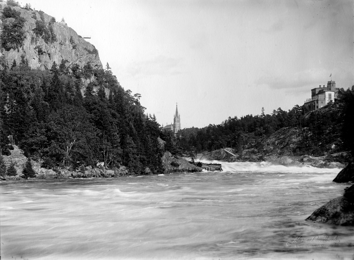 Helvetesfallet, Trollhättan. Trollhättans kyrktorn syns i bakgrunden och till höger ligger Hotell Bellevue, även kallat Utsikten.