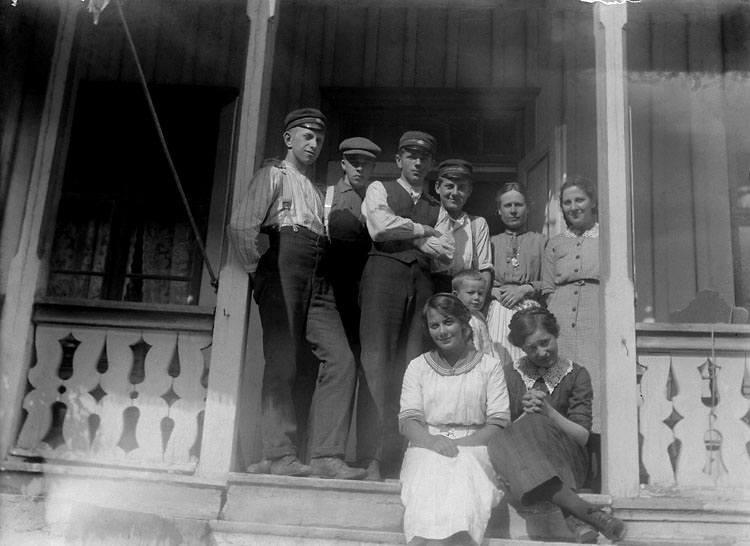 Enligt senare noteringar: " Wilma & Elsa Schiller, fru Sigrid Schiller, Vera Lundell, Gösta Boström, Kurt Jansson, Allan Sjöstedt och John Svensson. Taget på verandan på Hessleröd, 15/8 1914."