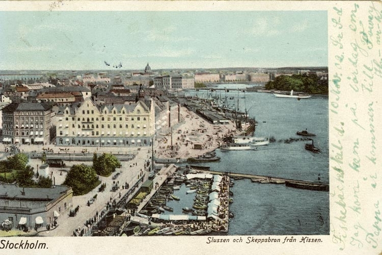 Kort: "Från Stockholm. Slussen och Skeppsbron från Hissen."