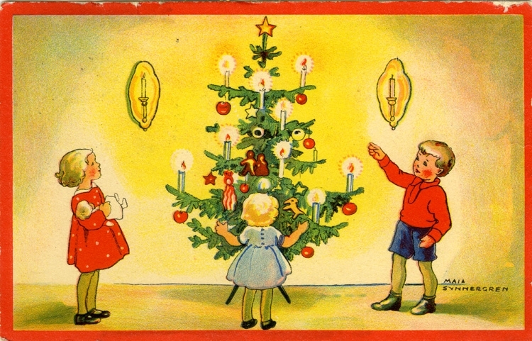 Kort med God Jul-hälsning. Tre barn runt julgranen.