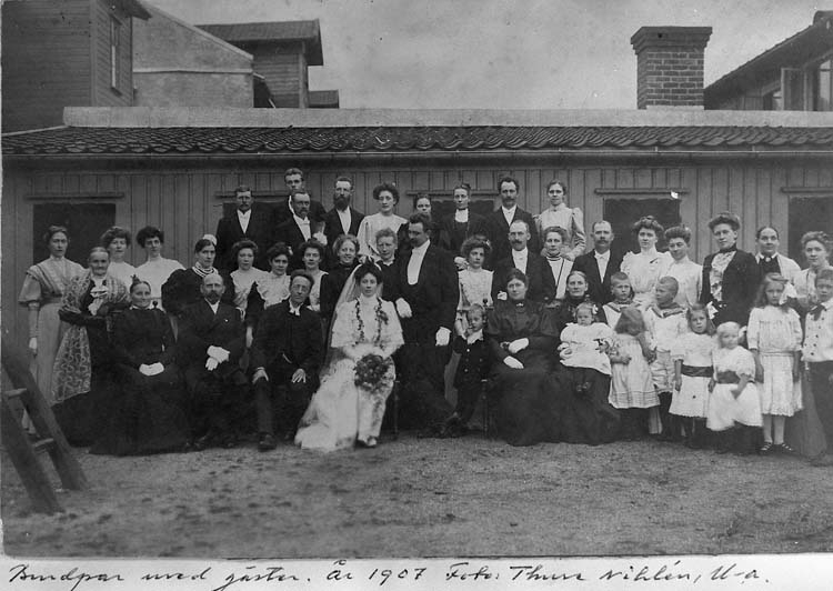 "Brudpar med gäster, år 1907. Foto Thure Nihlén, Uddevalla"
