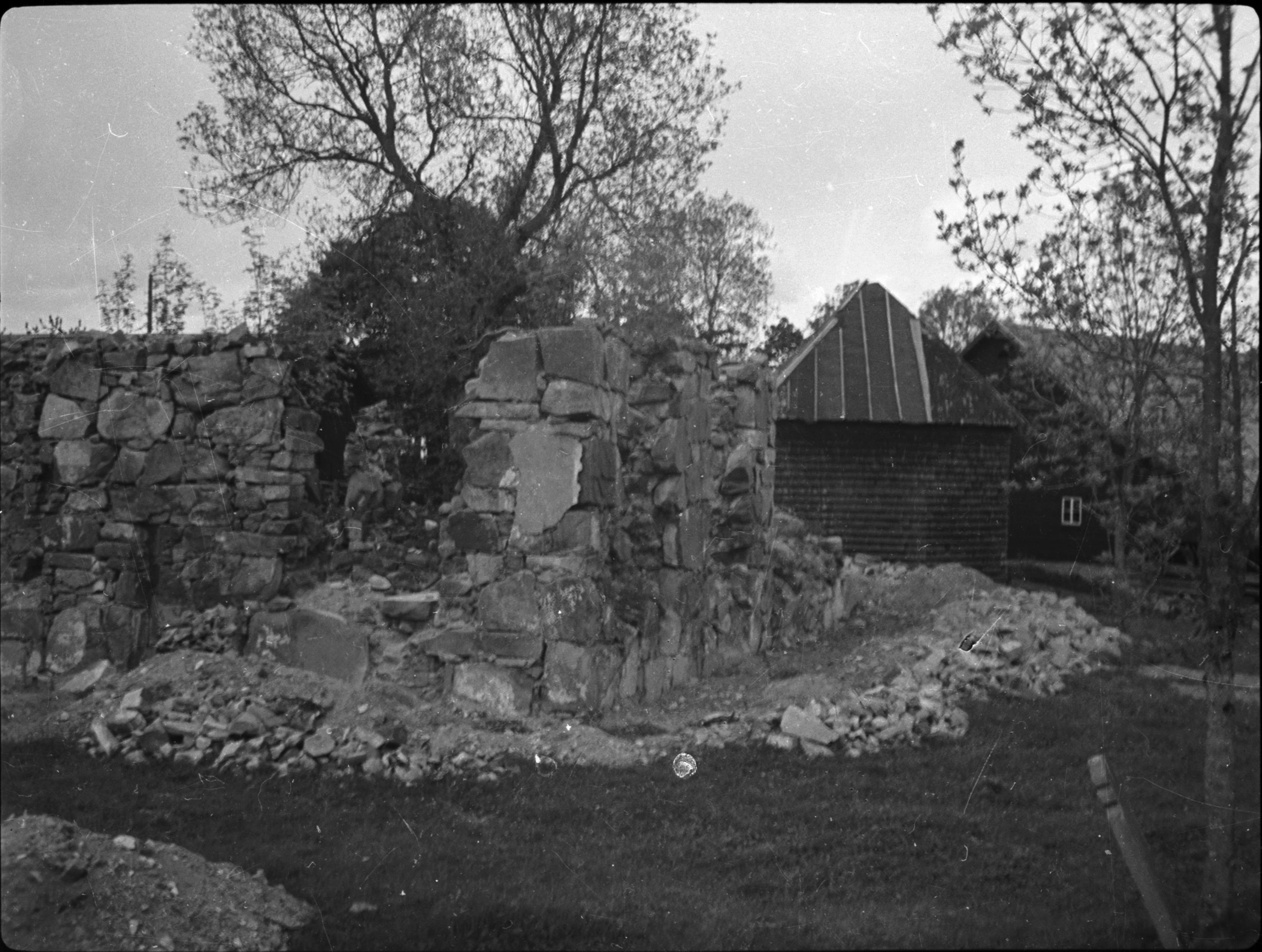 Gamla kyrkans ruiner med sockenmagasinet i bakgrunden.